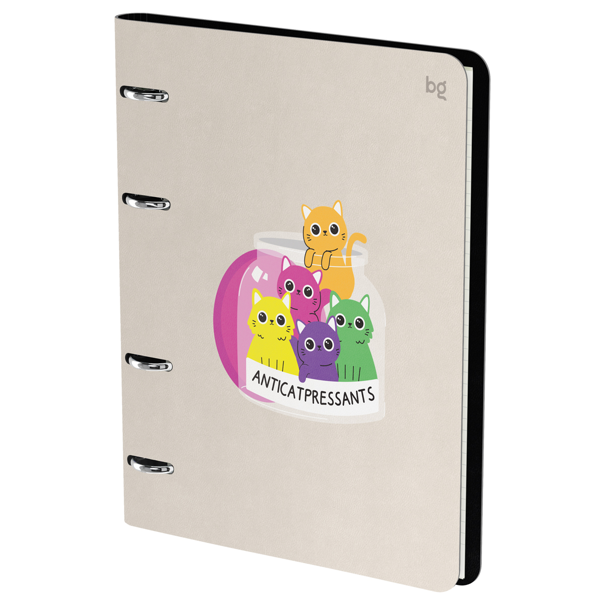 Общая тетрадь на кольцах «Котики» от bg — это стильный и функциональный инструмент для учёбы или работы. Благодаря кольцевому механизму легко добавлять и вынимать листы. Тетрадь можно адаптировать под любые задачи. Она подходит для большого объёма записей. Изделие в формате А5 легко взять с собой куда угодно. Тетрадь поместится в папку или рюкзак. Внутренний блок состоит из 120 листов тонированной бумаги плотностью 70 г/м². Обложка выполнена из высококачественной экокожи. В отделке используется тиснение фольгой. Тип линовки — клетка. Забавный дизайн привлечет внимание подростков.
