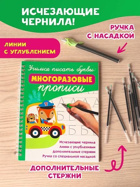 «Учимся писать буквы: многоразовые прописи» дополнены увлекательными играми, которые развивают логику и внимательность. Благодаря этой книге ребёнок не только улучшит навыки письма, но и разовьёт мелкую моторику, мышление и умственные способности.