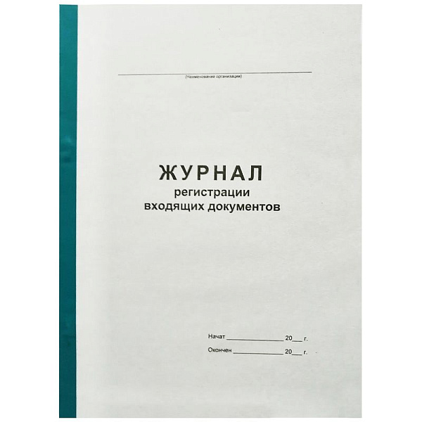 Журнал для регистрации входящих документов. Обложка -картон плотностью 220 г/м2, бумвинильный корешок. Внутренний блок - офсетная бумага плотностью 50-55 г/м2. Вид крепления –скрепка.