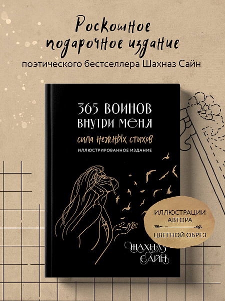 Уникальное и очень личное издание бестселлера «365 воинов внутри меня». Шахназ украсила его своими иллюстрациями и добавила небольшие вдохновляющие послания читателям. Все подписи и рисунки были сделаны автором вручную и бережно перенесены дизайнером на страницы книги.