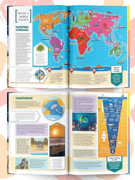 Помимо доступных описаний, прекрасных иллюстраций, познавательных карт и интересных фактов, в книге на каждом развороте имеются самые разные задания для юных знатоков. Ребятам предстоит ответить на вопросы для чего была построена Великая Китайская стена и какая часть Солнца самая горячая, на какие группы делятся все живые организмы планеты, назвать самое большое и самое маленькое государство в мире, рассказать, на какие группы делятся все живые организмы на планете, найти на карте самый большой остров и крупнейшие реки мира, объяснить, почему на полюсах Земли так холодно.
