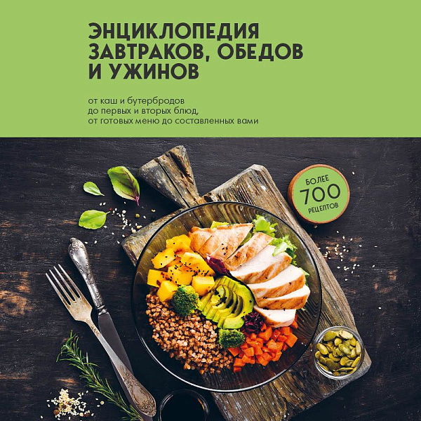 Знать заранее, что приготовить на завтрак, обед и ужин — желание каждой хозяйки, готовящей каждый день для своей семьи. Эта книга поможет вам быстрее ориентироваться в том, что, как и когда лучше подать на стол. Она поделена на главы ЗАВТРАКИ, ОБЕДЫ, УЖИНЫ, а внутри глав разделена на уже готовые меню и на отдельные виды блюд, присущие каждой трапезе. В конце книги вы найдете алфавитный указатель рецептов, который также облегчит поиск необходимого рецепта. А внутри блока текста размещены прекрасные цветные иллюстрации с дополнительными рецептами. Более 700 рецептов, выверенных, доступных и разнообразных. С этой энциклопедией жизнь на кухне станет легче!