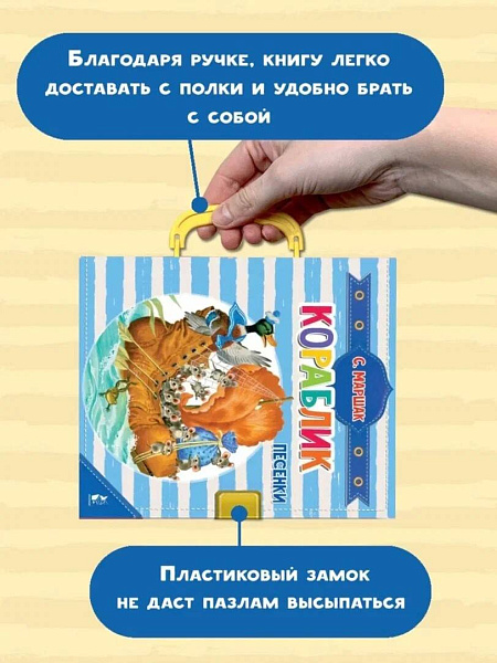 Любимые песенки в переводе С. Я. Маршака теперь в новом формате! Знаменитые герои - Робин-Бобин, Шалтай-Болтай и другие - рассмешат малыша, а ещё - научат доброте и народной мудрости. Яркие иллюстрации и пазлы из 6 частей на каждом развороте развивают мелкую моторику и внимание, а короткие стихотворные строчки легко запоминаются. К книге прикреплен удобный замочек с ручкой, благодаря которым книгу будет удобно взять с собой в дорогу и поиграть с ребенком!