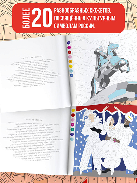 Этот творческий альбом объединяет несколько увлекательных жанров раскрашивания. На каждой странице вас ждут различные задания-квесты с непредсказуемым ярким результатом. Пока задание не пройдено — сюжеты и колорит картин остаются загадкой. Более 20 сюжетов альбома посвящены культурному наследию, традициям и символам России. Вы раскрасите по номерам, пикселям и соедините по точкам архитектурные памятники, шедевры русской живописи и прикладного искусства, а также портреты выдающихся людей, чьи достижения сделали нашу страну великой.