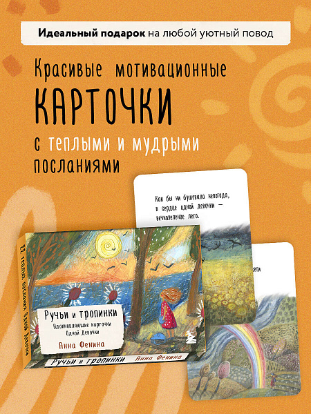 Вдохновляющие карты «Ручьи и Тропинки» — это набор из 22 теплых и мудрых посланий от Анны Фениной — автора бестселлера целебных сказок «Одна девочка собирала стаю», метафорических карт «Сила Стаи» и др. Эти карточки созданы для того, чтобы помогать пересекать безлюдные пустоши и густые чащи на пути к мечте, принимать решения на развилках самых разных дорог и чувствовать, когда нужно взяться за весла, а когда — довериться течению.